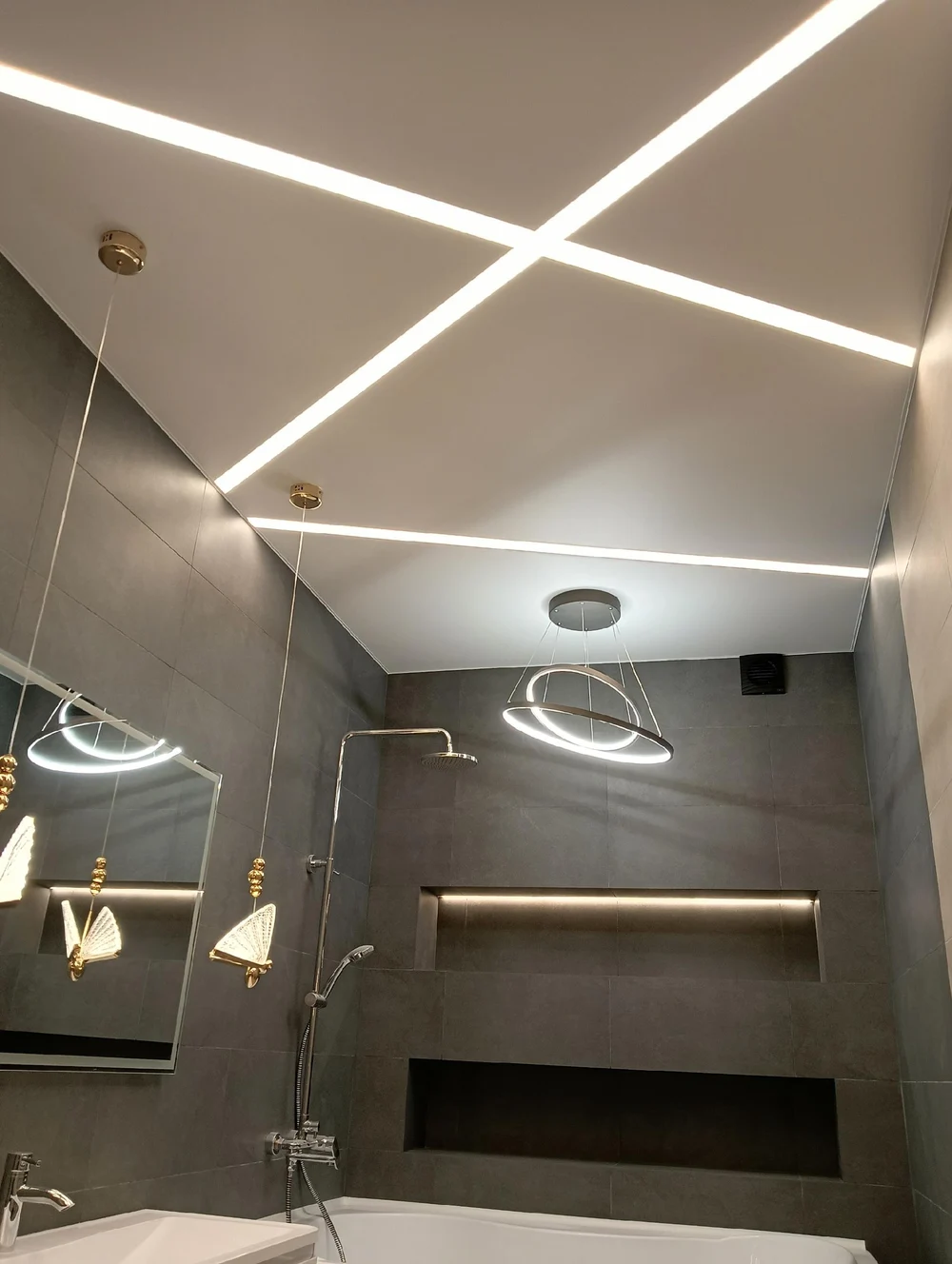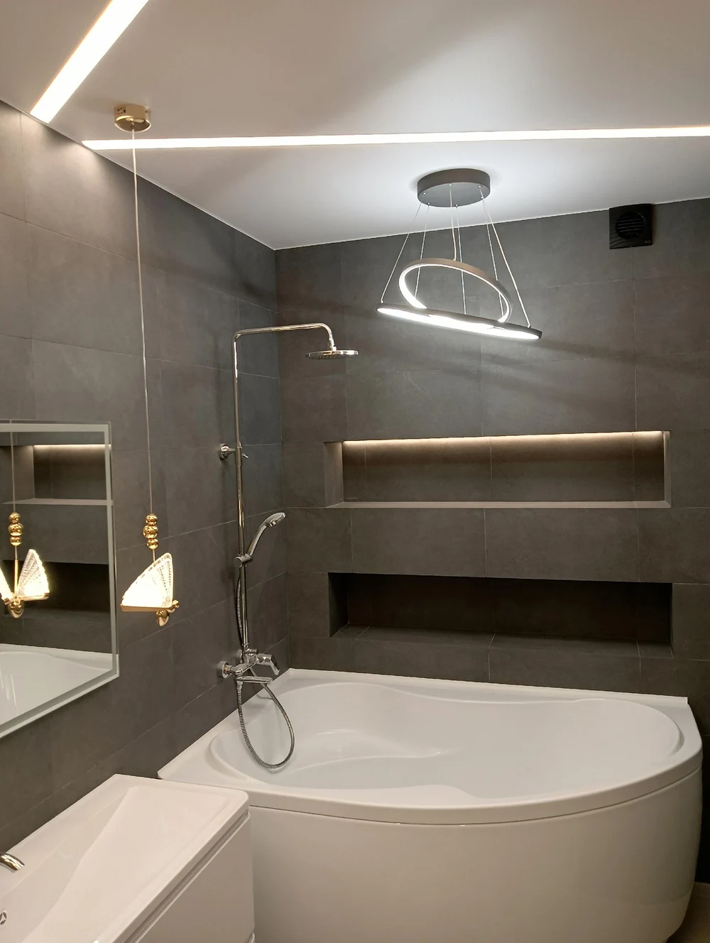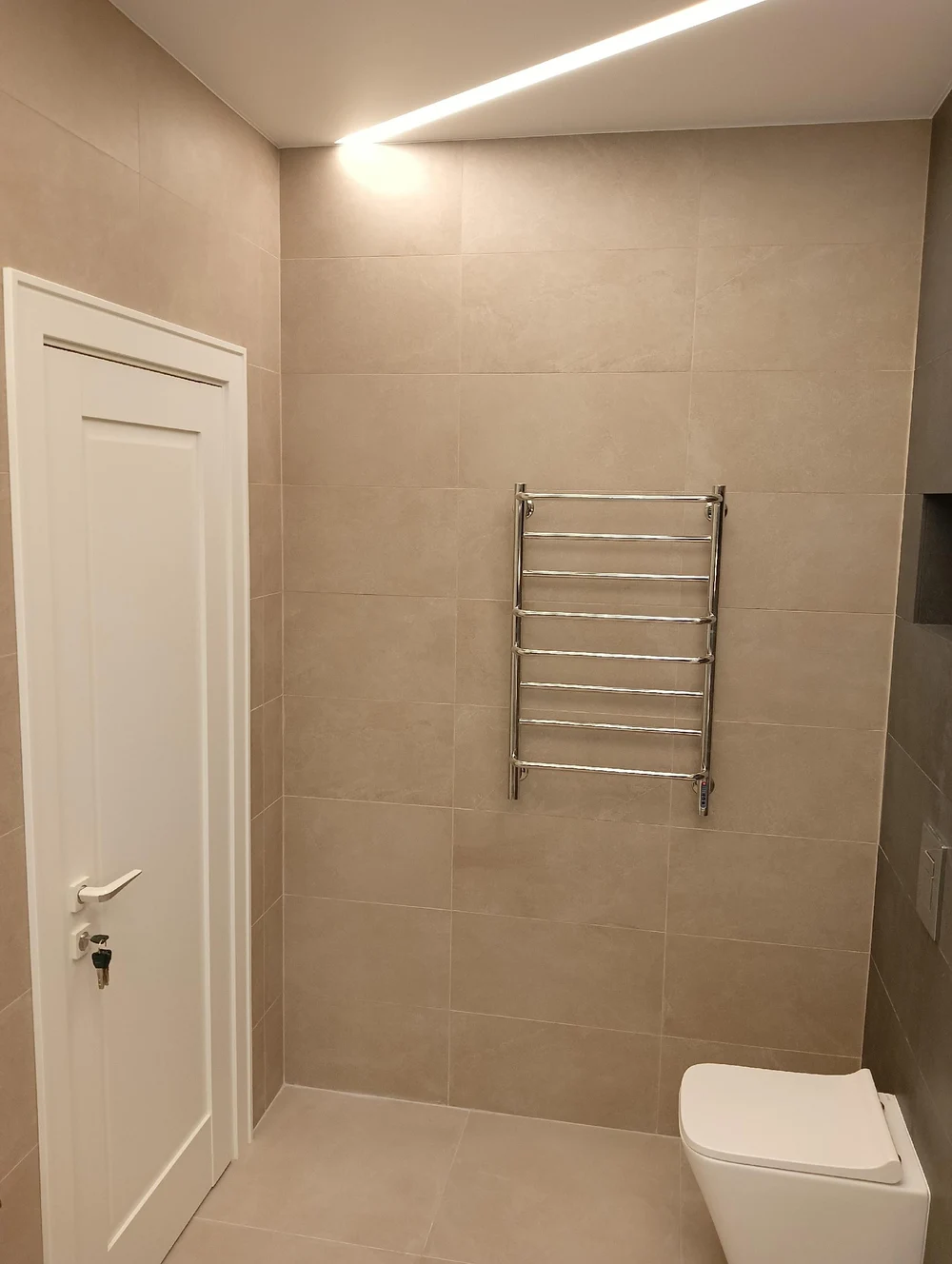 Коридор 1 и 2 в квартире на Черняховского 52А под ключ! Стены- декоративная штукатурка, обрамление портала- АМК, натяжной потолок со световыми линиями, пол - керамогранит, двери установили скрытого монтажа под покраску в ванну и туалет, на полу теневой плинтус