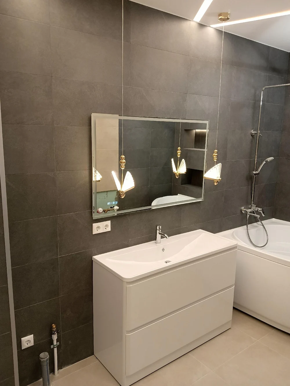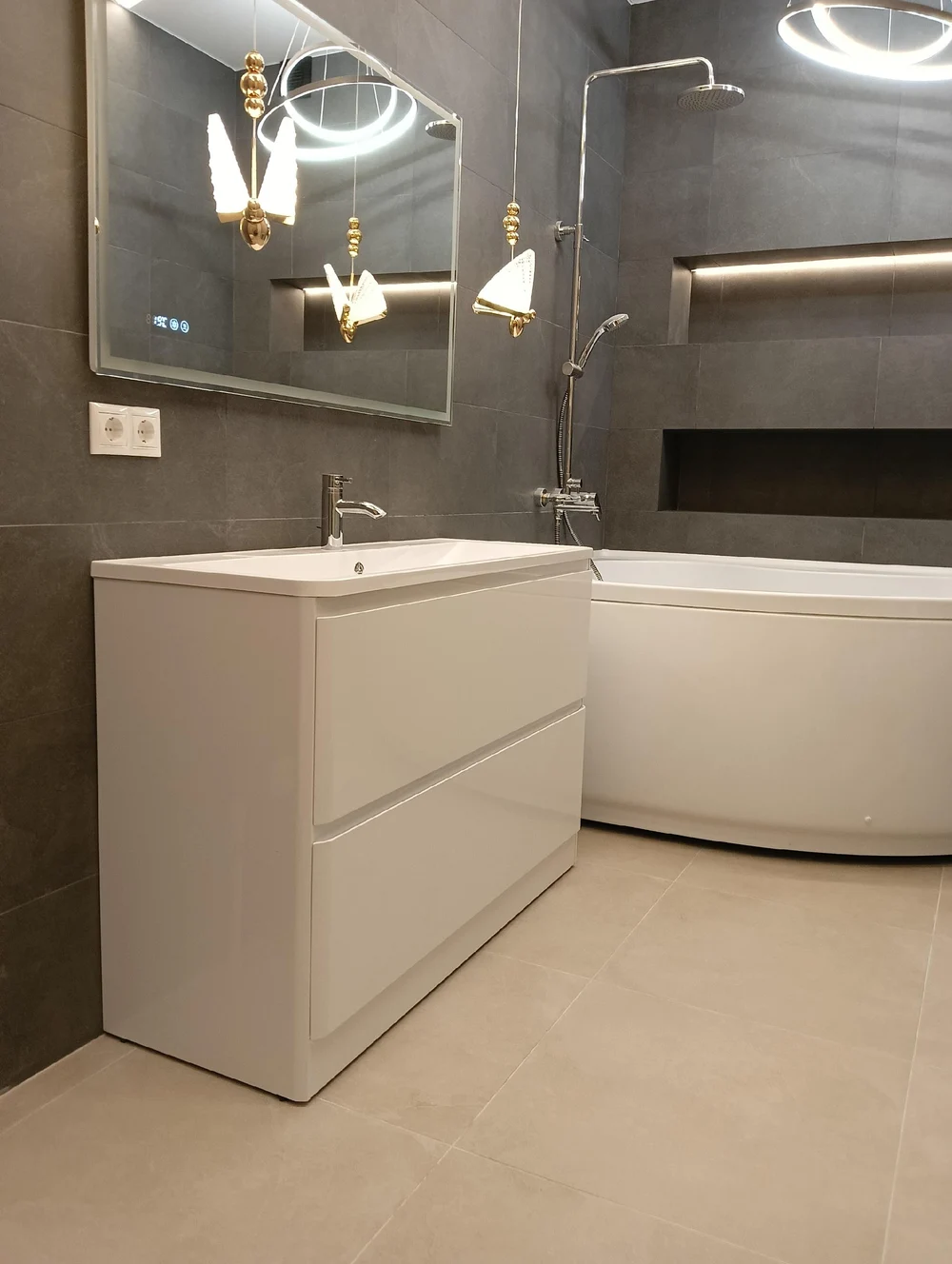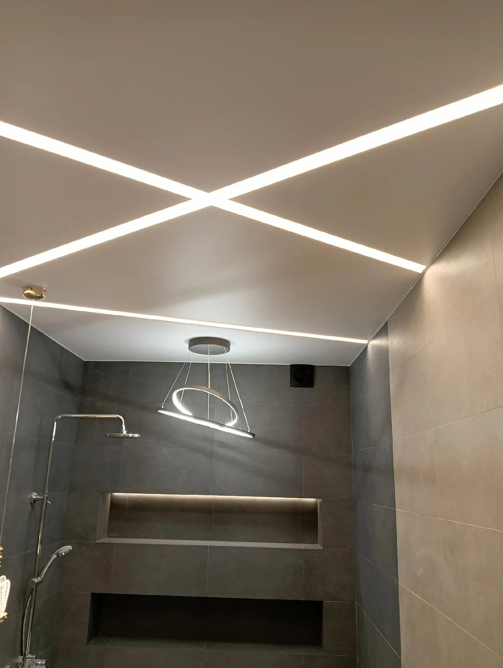 Коридор 1 и 2 в квартире на Черняховского 52А под ключ! Стены- декоративная штукатурка, обрамление портала- АМК, натяжной потолок со световыми линиями, пол - керамогранит, двери установили скрытого монтажа под покраску в ванну и туалет, на полу теневой плинтус